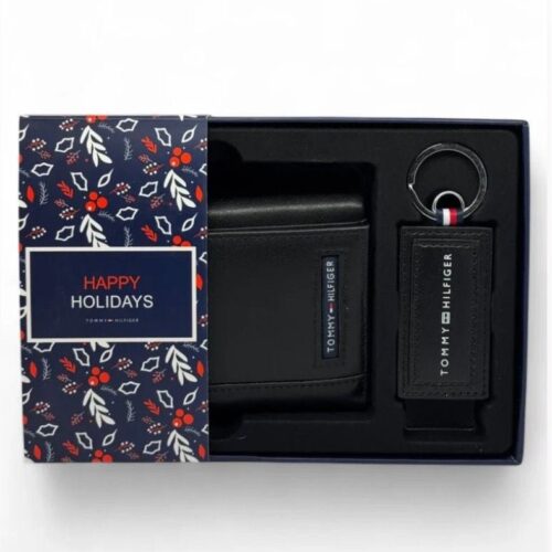 This Tommy Hilfiger set is a sophisticated and practical accessory designed for the modern man who values both style and functionality. It combines a sleek bi fold wallet, a handy card holder, and a key chain, all crafted from high-quality leather in a classic black color. The set exudes an air of luxury and promises lasting durability.