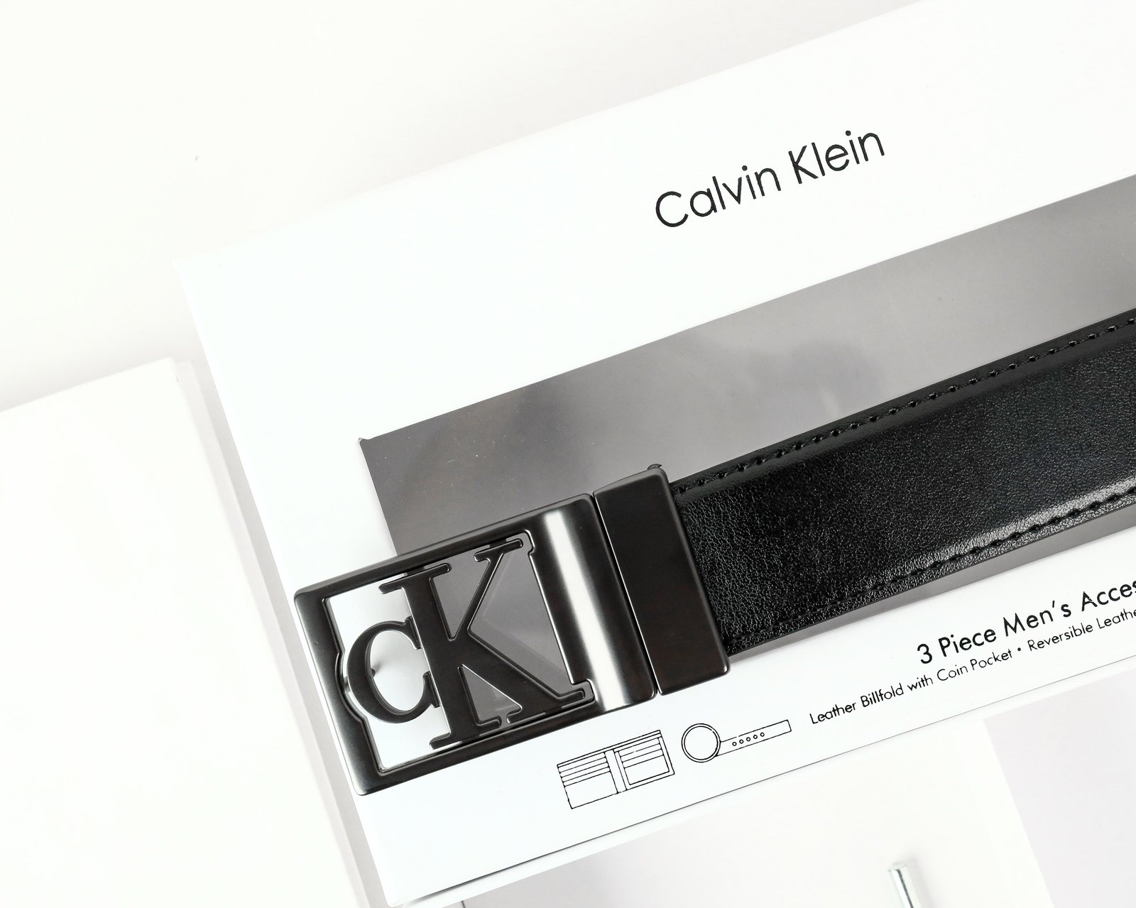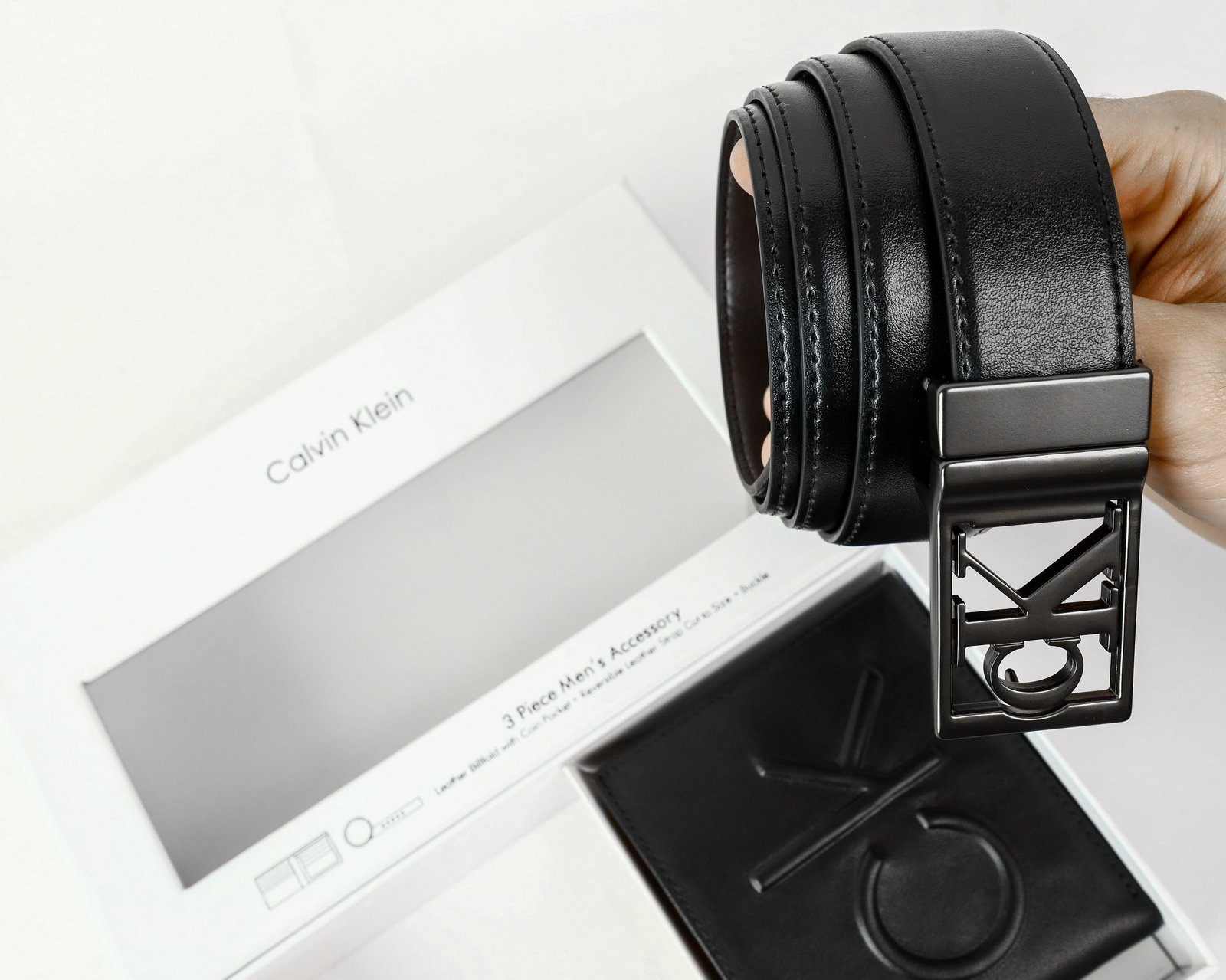 This Calvin Klein set combines a sleek black leather belt with a distinctive “CK” logo buckle and a compact black leather wallet with multiple card slots and a cash compartment, all crafted from premium leather for a sophisticated and functional accessory package.
