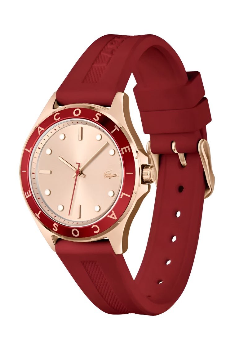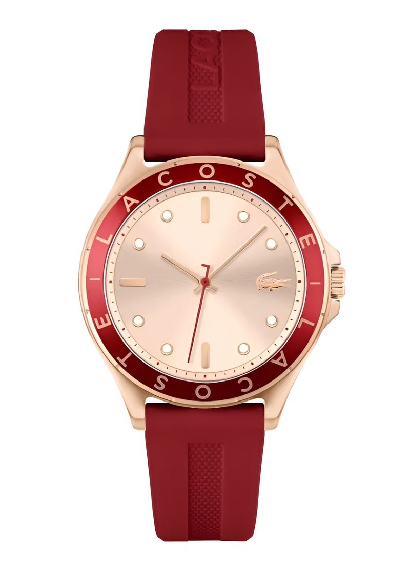 Add a pop of sporty elegance to your look with the Lacoste women’s watch. This eye-catching timepiece features a sophisticated rose gold dial complemented by a striking red bezel boldly displaying the “LACOSTE” lettering. The iconic Lacoste crocodile logo and the case are presented in a warm rose gold-tone, adding a touch of modern femininity to its design