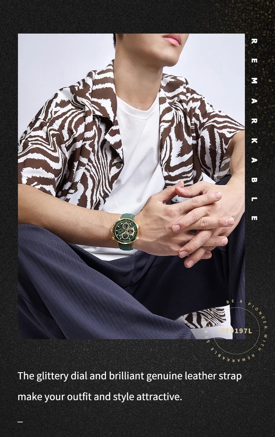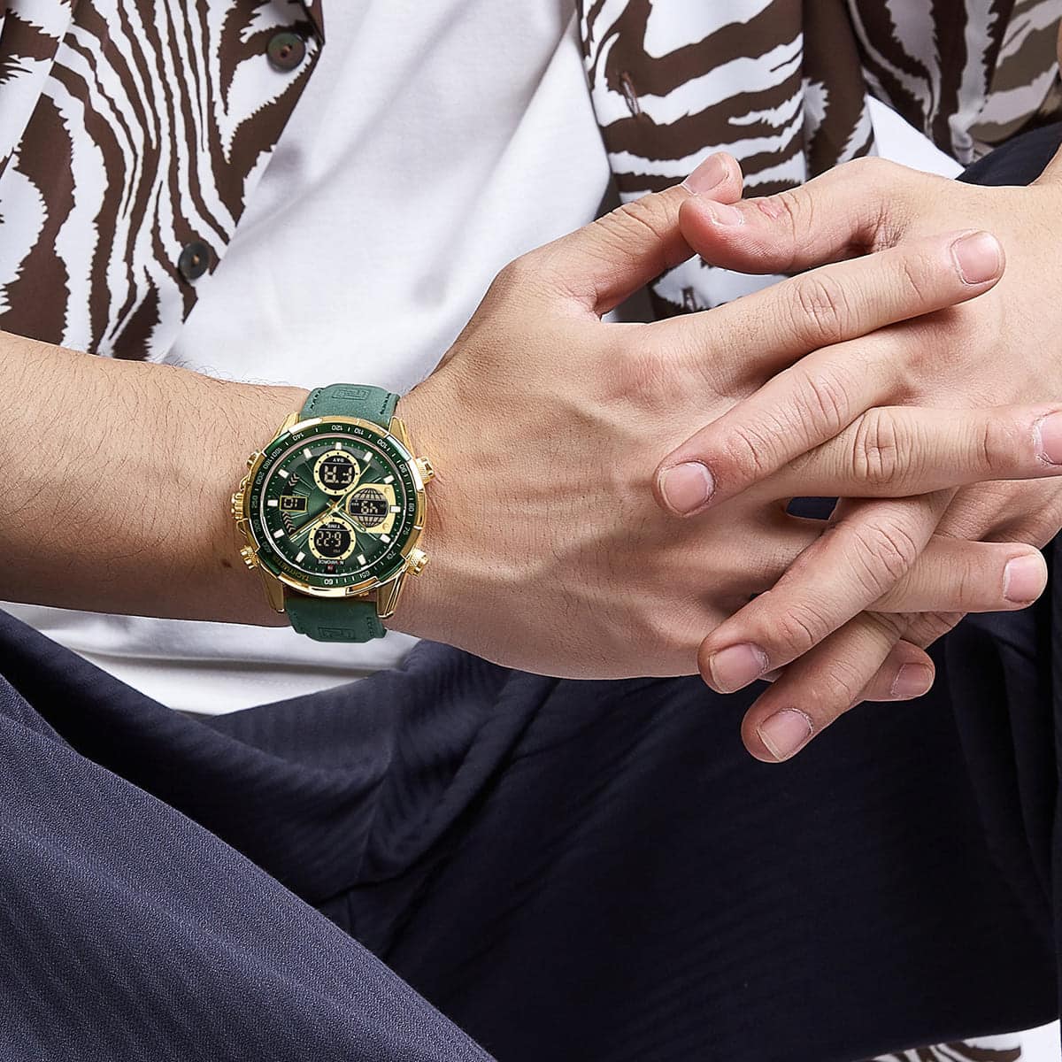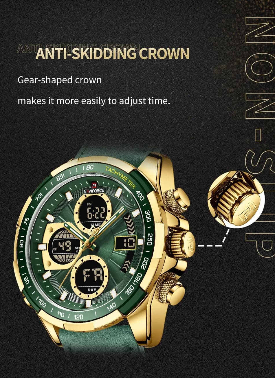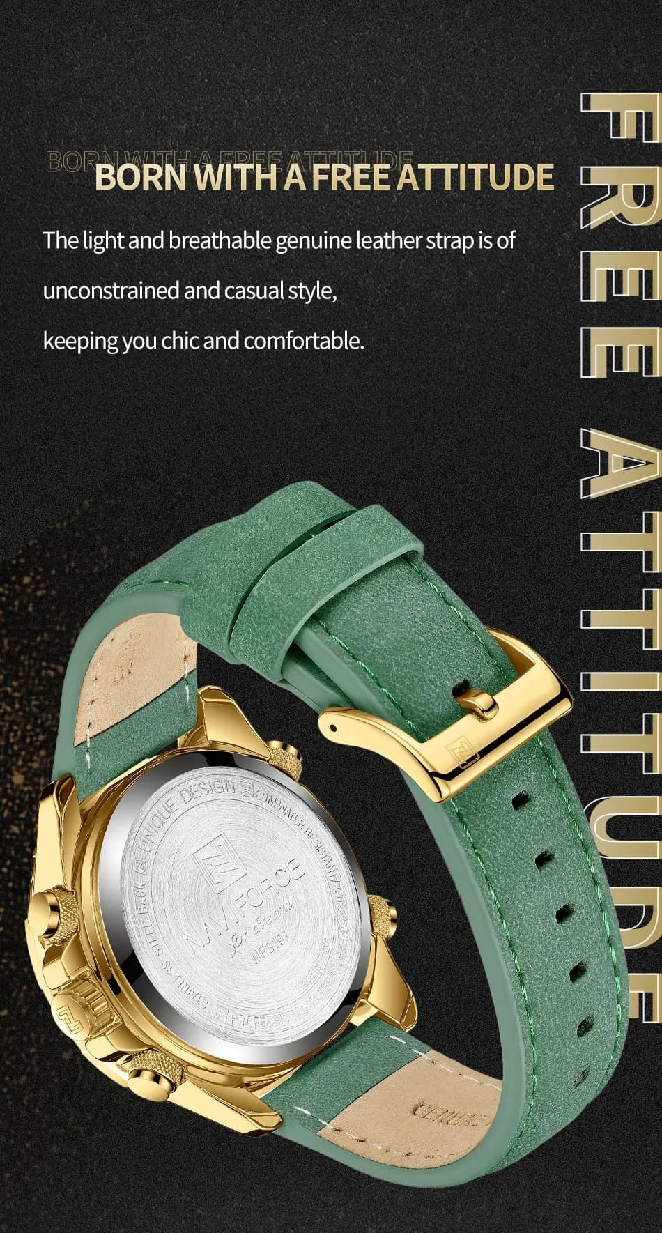 Green Leather strap offers a modern and versatile look that matches both formal and casual outfits.