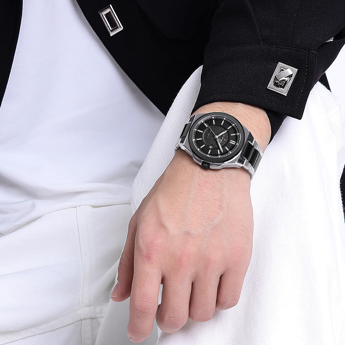 Silver & Black Stainless steel strap offers a modern and versatile look that matches both formal and casual outfits.